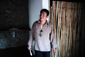 In this intimate scene, a middle-aged man stands by a rustic wooden wall, his expression revealing warmth and thoughtfulness. Soft, natural light filters through the space, casting gentle shadows that accentuate the earthy tones of his clothing and the textured backdrop, creating a serene yet engaging atmosphere.