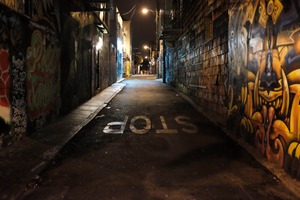 A narrow alleyway illuminated by streetlights casts long shadows against vibrant graffiti-covered walls. The sense of solitude is palpable, with the solitary 'STOP' sign adding a hint of urgency to the stillness. The composition draws the eye further down the corridor, inviting exploration amidst the colorful chaos.
