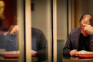 The photograph captures a solitary man deep in thought, framed within a reflective glass partition. Soft lighting bathes the scene, casting a warm, intimate glow over the subject, whose hand rests on his forehead, suggesting a moment of contemplation or concern. The composition plays with reflection and space, enhancing the mood of isolation amidst the surrounding environment.