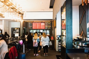 The photograph captures a lively yet relaxed atmosphere inside a modern eatery, where patrons are queued in front of a vibrant menu. Soft, natural light streams in, highlighting the stylish interior design features, while the warm tones and arrangement of furniture invite a sense of comfort. The composition emphasizes both the anticipation of the customers and the enticing offerings available, creating a cozy yet bustling mood.