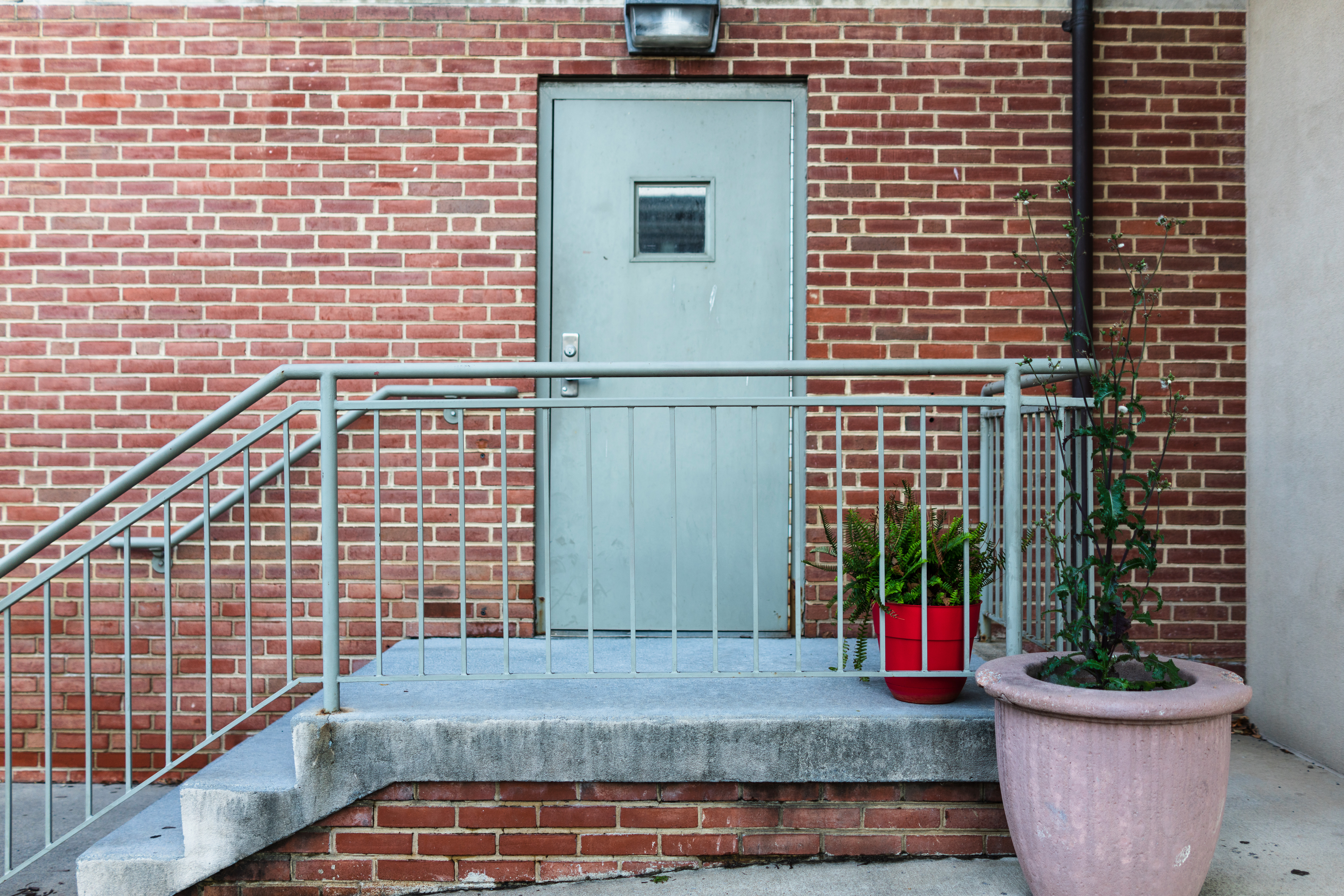 The photograph captures a humble entryway framed by a textured brick wall, emphasizing the stark contrast between the coldness of metal and the warmth of greenery. A muted green door, slightly ajar beneath a stark overhead light, hints at a threshold to hidden spaces beyond. The cheerful red pot juxtaposes the industrial surroundings, infusing life into the scene and creating a sense of quiet resilience.
