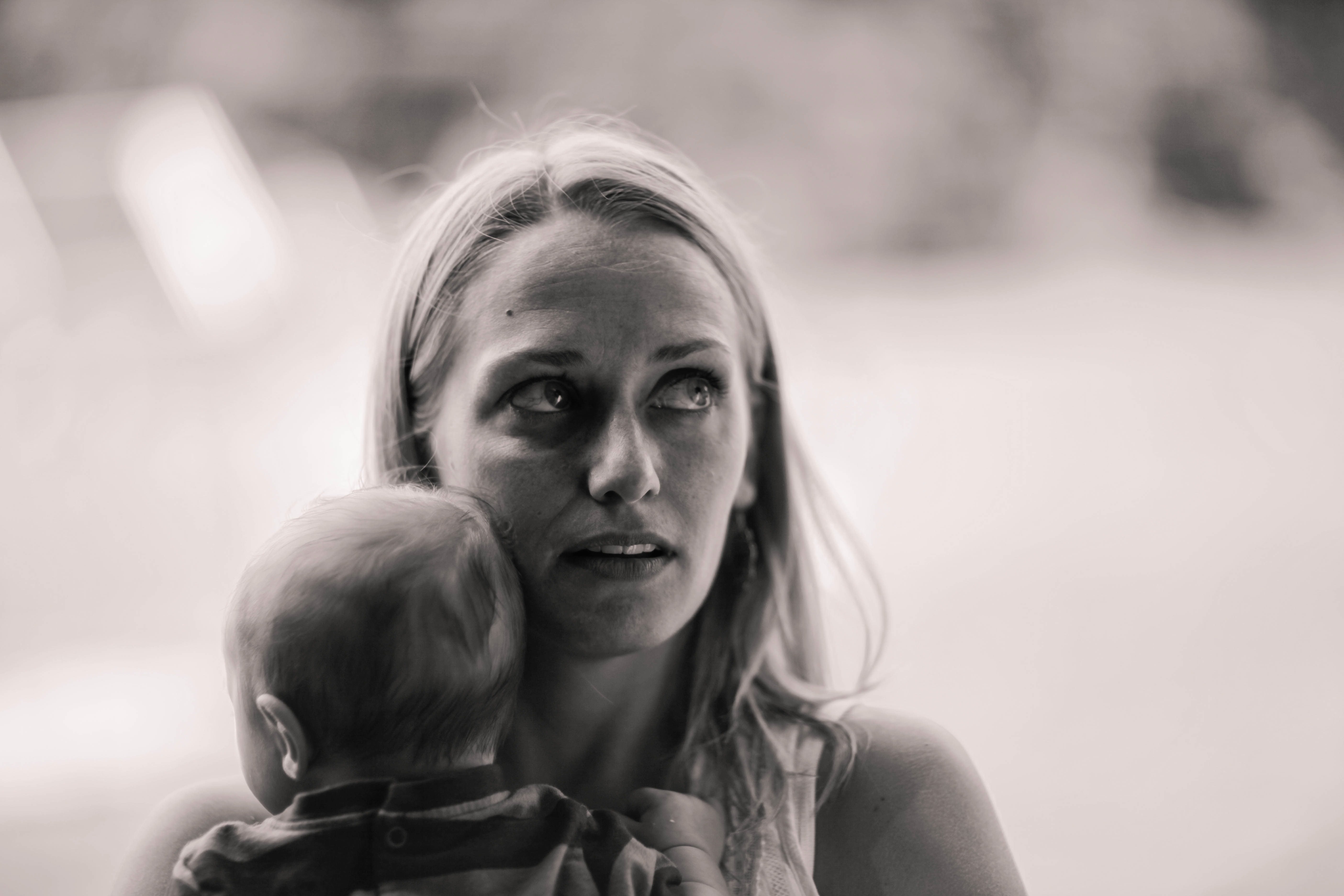 In this intimate portrait, a mother holds her child close, her expression revealing a blend of concern and serenity. The soft, monochromatic tones enhance the emotional weight of the moment, while the ethereal background blurs away, drawing focus to their connection. Gentle light accentuates her features, evoking a sense of warmth and protectiveness in the scene.