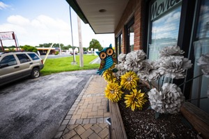 This photograph captures a playful scene of a vibrant, decorative owl perched among artificial flowers in a rustic planter. The contrast between the bright yellow sunflowers and the muted grey blooms evokes a cheerful yet nostalgic mood, enhanced by the soft, diffused lighting. The composition draws the viewer’s eye diagonally, hinting at a lively environment just beyond the frame, blending nature with urban life.