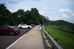 A solitary figure stands near the edge of a parking area, gazing out at a lush green hillside under a vast, blue sky dotted with fluffy clouds. The composition is marked by clean lines and a tranquil mood, highlighted by soft, natural lighting that evokes a sense of peace and solitude. The vehicles parked nearby add a modern touch to the serene landscape, bridging the abstract and the natural world.