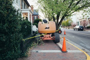 In a quiet neighborhood, an orange cherry picker occupies the sidewalk, its imposing frame contrasting against the charming architecture of nearby homes. The mood is one of unexpected disruption, amplified by the caution tape and traffic cones that mark its presence. Soft daylight filters through the trees, creating a juxtaposition of nature and machinery, inviting contemplation on the intersection of industry and residential life.