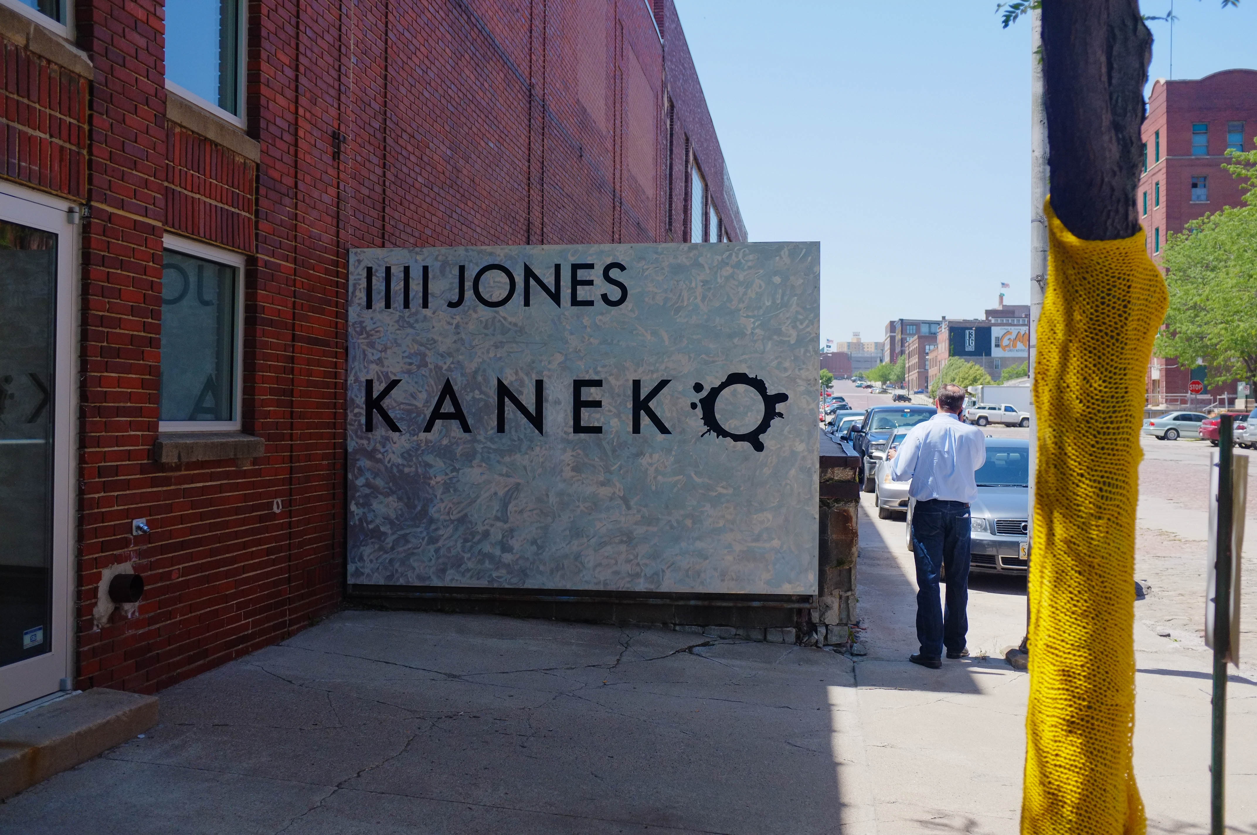 The photograph captures a moment in an urban setting, showcasing a contemporary art space named Kaneko against the backdrop of a textured red brick wall. Bright sunlight bathes the scene, casting soft shadows and highlighting the interplay between the modern sign and the rustic architecture. A solitary figure is seen walking away from the camera, suggesting a contemplative mood amidst the vibrant city life.