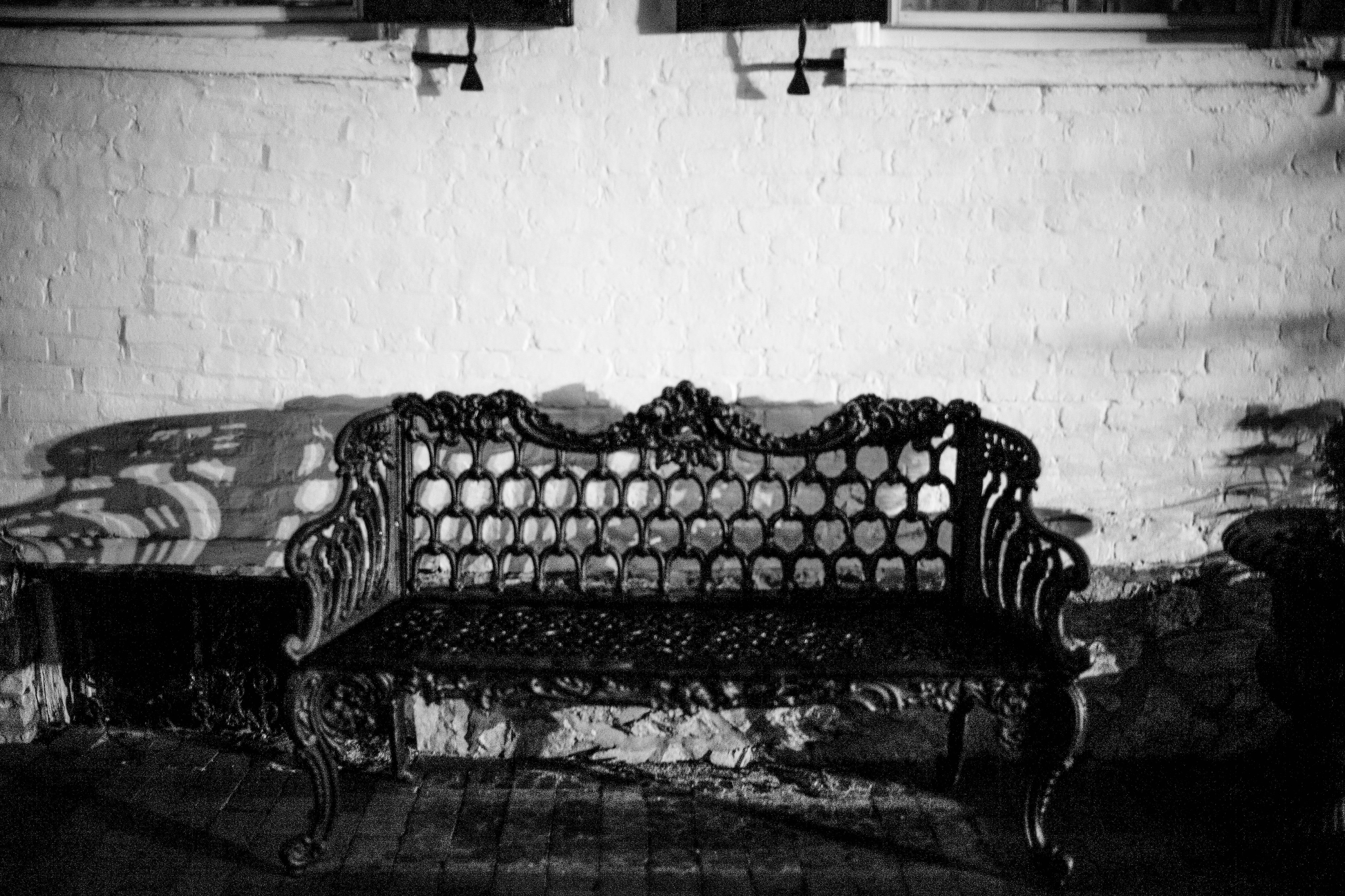 The photograph features an ornate wrought-iron bench casting intricate shadows against a stark white wall, evoking a sense of calm and solitude. The low, mysterious lighting heightens the bench's vintage charm, while the emptiness around it invites contemplation. The composition balances texture and shadow, creating a moody atmosphere reminiscent of quiet nights spent in reflection.