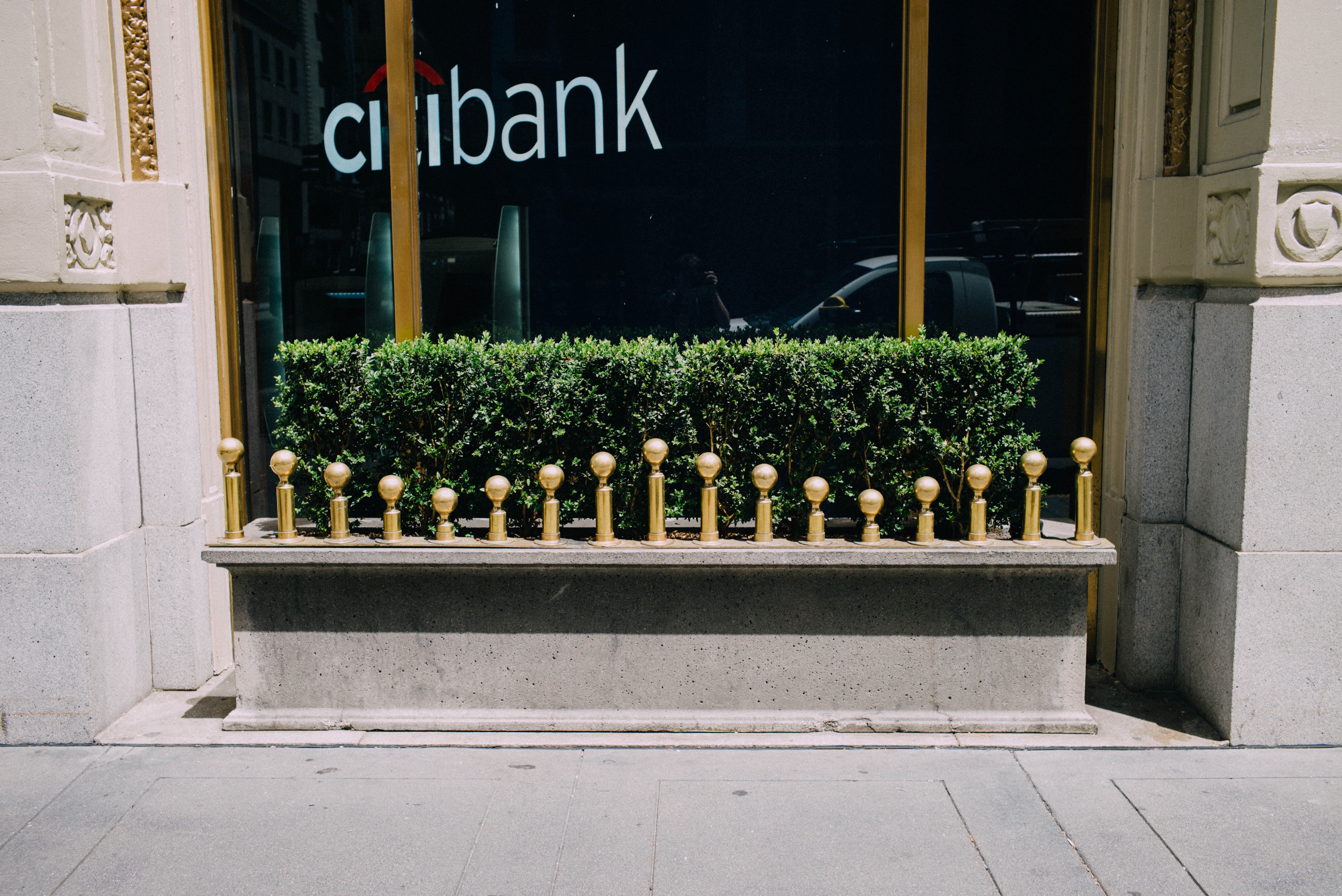 This photograph captures a polished stone ledge adorned with gleaming golden bollards, neatly lining a manicured hedge. The reflective glass of the bank facade looms in the background, contrasting the vibrant greenery with the stark urban setting. The warm sunlight bathes the scene, creating a serene yet structured ambiance in the heart of the city.