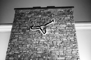The photograph captures a striking stone wall featuring a backlit emblem of a longhorn, creating a dramatic contrast against the textured surface. The monochromatic palette enhances the mood of elegance and rustic charm, while the lighting highlights the intricate patterns of the stone. The composition draws the viewer's eye upward, emphasizing the emblem's significance as a focal point and symbol of strength.