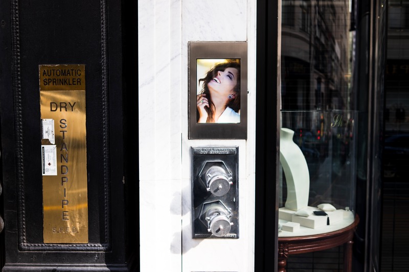 This photograph juxtaposes a glamorous portrait of a woman with utilitarian urban elements, such as a fire standpipe and an automatic sprinkler. Bright natural light enhances the subject's joyful expression, creating a striking contrast with the metallic fixtures beside her. The composition cleverly blends beauty and function, inviting viewers to explore the relationship between art and everyday life.