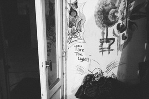 The photograph captures a dimly lit corner of an artistic space, with a partially open door framing a chaotic mural that contrasts dark and vibrant elements. The phrase 'you are The Light!' emerges boldly among haunting imagery, setting a tone of introspection amidst the raw creativity. The interplay of light and shadow enhances the mood, inviting viewers to explore the juxtaposition of darkness and affirmation.