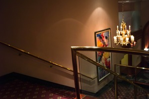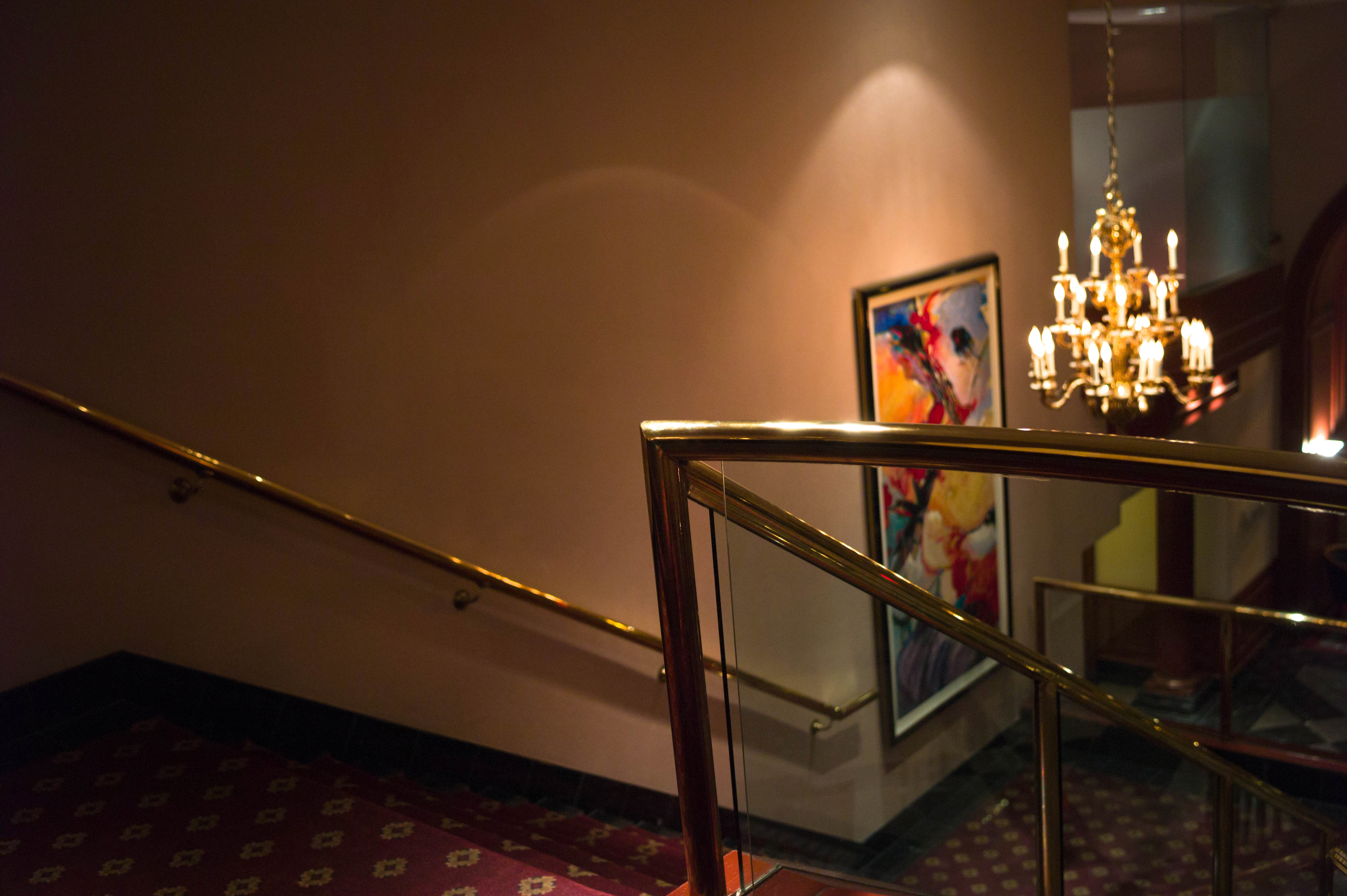The photograph captures a softly lit staircase, leading downwards with a polished railing that reflects the warm glow of a chandelier above. An abstract painting adds a pop of color against the neutral wall, creating a sense of sophistication and intrigue. The mood is inviting yet mysterious, suggesting a hidden world just beyond the frame.