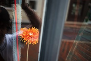 In this photograph, a vibrant orange flower stands out against a blurred, reflective background, embodying a juxtaposition of life amidst urban elements. The soft light delicately illuminates the petals, creating a sense of warmth while the glass adds a layer of depth and complexity. The hand reaching from the side hints at human interaction, adding an intimate touch to the tranquil scene.