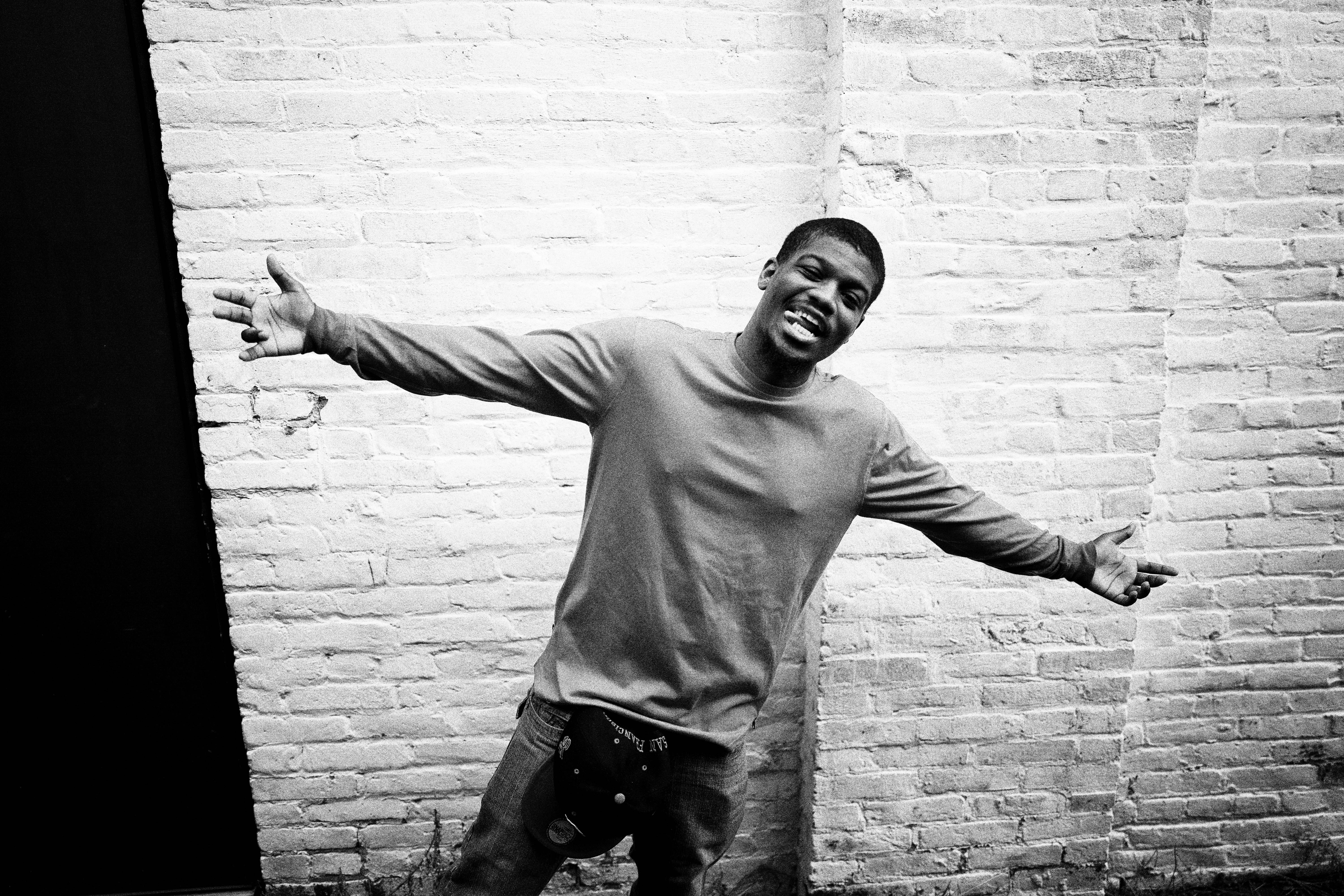 A young man radiates enthusiasm against a textured, light-colored brick wall. His open arms and wide smile convey a sense of freedom and joy, enhanced by the stark contrast of the black and white composition. The soft lighting captures the warmth of the moment, creating an inviting atmosphere.