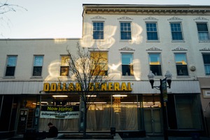 The photograph captures a Dollar General store framed by soft, warm lighting as reflections play lightly on its textured façade. A solitary figure sits near the entrance, absorbed in their thoughts, evoking a sense of stillness amidst the vibrant urban setting. The stark contrast between the inviting glow of the store and the serene shadows creates an intriguing juxtaposition that invites contemplation.