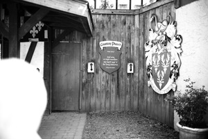 A rustic wooden corner houses an intriguing display of old-school courtesy phones, etched signs, and a vibrant coat of arms, all set against a backdrop of muted tones. The black-and-white composition evokes a sense of nostalgia, emphasizing the texture of the aged wood and the vintage artifacts. Subtle lighting hints at a serene atmosphere, inviting contemplation of the stories held within this quiet nook.