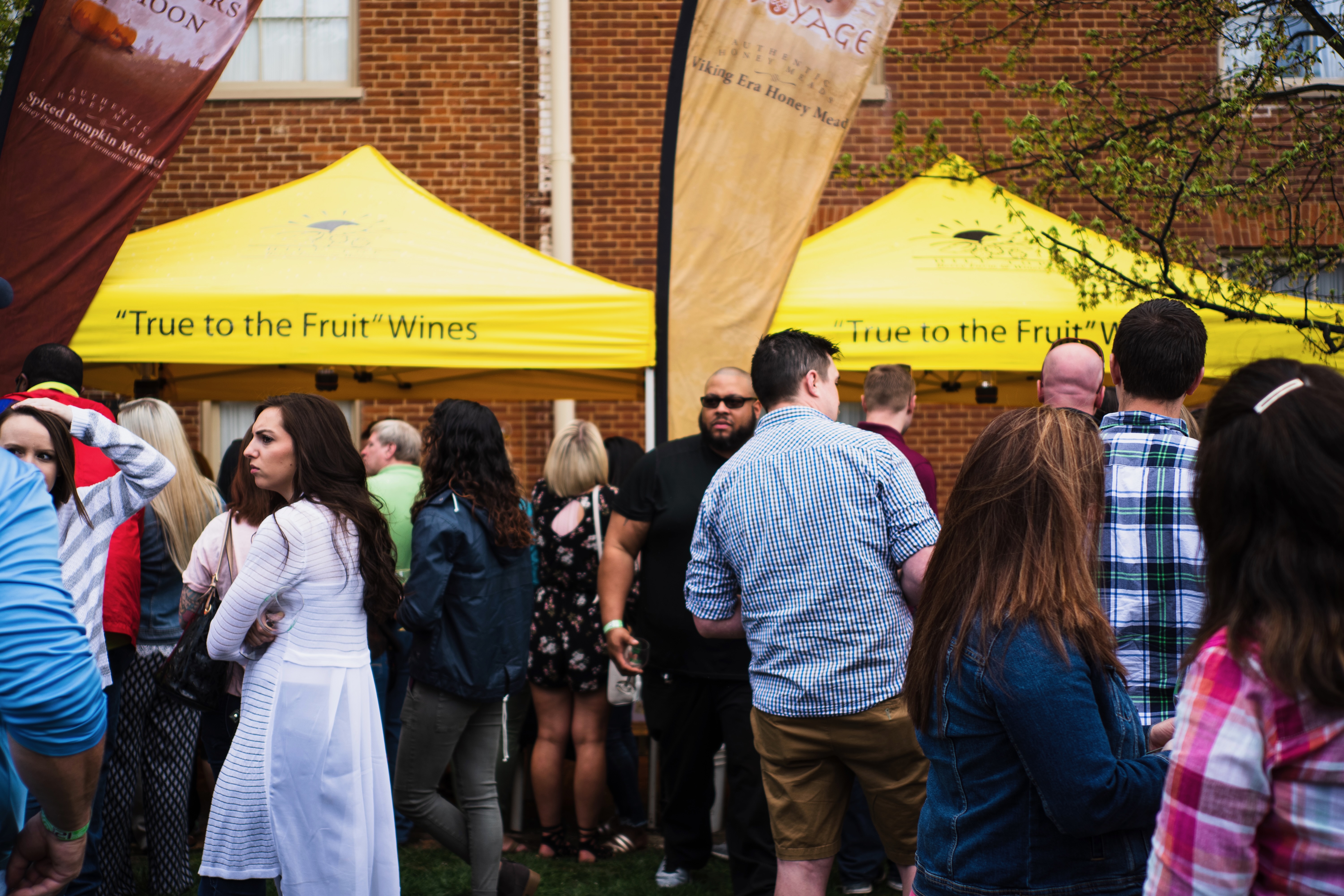 At a vibrant outdoor event, guests mingle under bright yellow tents promoting local wines. The mood is lively yet intimate, with clusters of people engaged in conversation, while muted sunlight filters through the overcast sky, casting soft shadows across the crowd. The composition draws the eye towards the tents and banners, hinting at the promise of the flavors within.