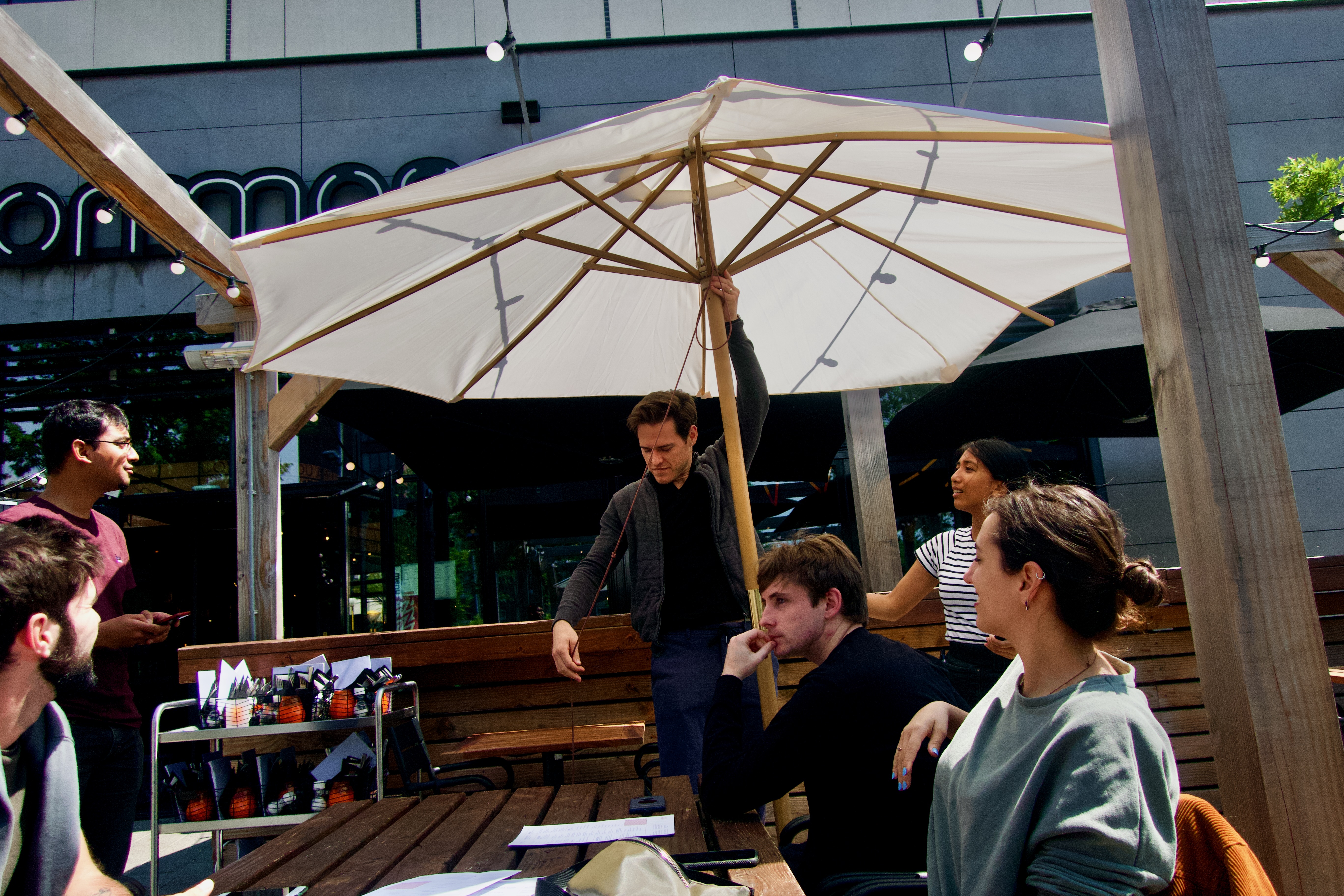 Amidst a lively outdoor café, a group of friends engages in conversation, their expressions reflecting camaraderie and focus. A man shifts a large umbrella, casting playful shadows over the wooden tables, while soft sunlight perfectly highlights the moments of laughter and contemplation. The warm ambiance, punctuated by vibrant greenery in the background, creates a cheerful and inviting atmosphere.