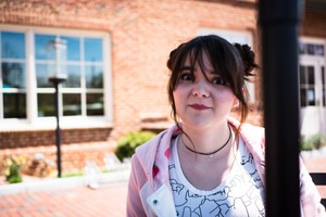 The photograph captures a young woman with an expressive gaze, conveying a sense of playful curiosity. Bright, natural light accentuates her features, creating a cheerful yet slightly mischievous mood. The blurred background provides context while keeping attention focused on her animated expression and relaxed pose.