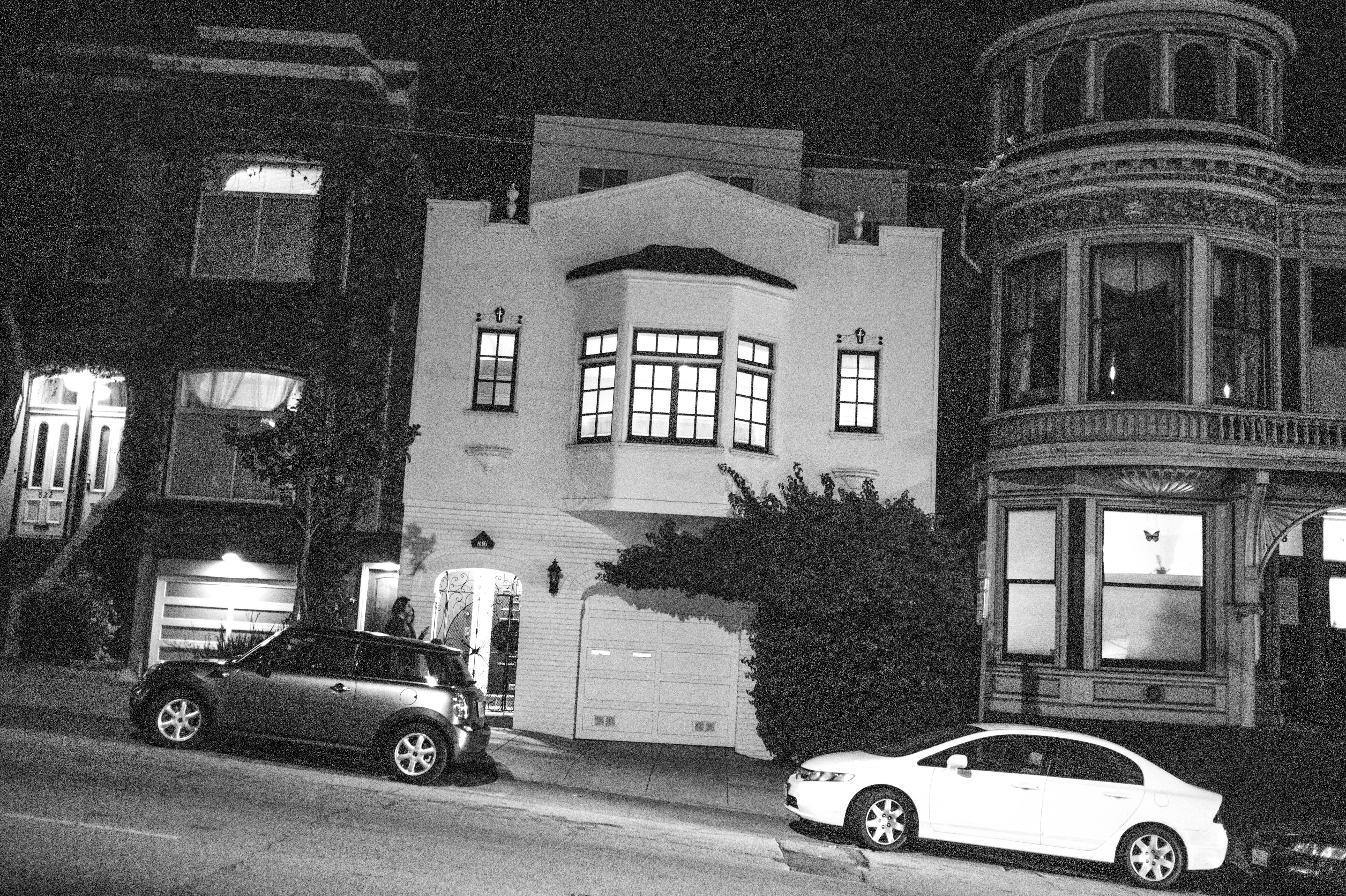 This photograph captures a charming street scene at night, where a stark white house stands out against the darkened facades of its neighbors. The composition highlights the contrast between the lighted windows and black surroundings, evoking a sense of quiet intimacy. With the surrounding vehicles parked beneath a muted glow, the atmosphere feels both serene and contemplative, embodying the peaceful stillness of the urban night.