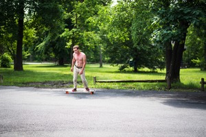 A young man skates confidently in a serene park, embodying a carefree summer spirit. The warm sunlight filters through the lush green trees, casting dappled shadows on the pavement. His casual stance and relaxed demeanor reflect the joy of outdoor activity, creating a vibrant atmosphere of freedom and youth.