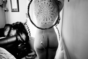 In this striking black-and-white photograph, a naked figure stands with their back turned, partially obscured by a delicate dreamcatcher. The soft lighting highlights the curves of the body while contrasting with the intricate patterns of the dreamcatcher, creating a mood of intimacy and mystique. The composition draws the viewer's eye through the interplay of shadows and textures, evoking a sense of introspective beauty and raw emotion.