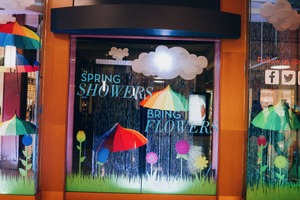 This vibrant storefront window showcases a playful spring theme, featuring colorful umbrellas and cheerful flowers against a backdrop of cascading water. The lighting accentuates the bright hues, creating a fresh and inviting atmosphere that captures the essence of renewal. The whimsical design invites passersby to embrace the joy of the season while hinting at the beauty that follows spring showers.