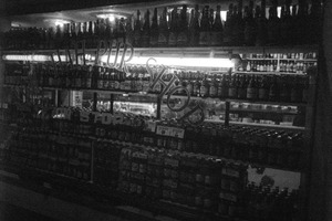 The photograph captures a dimly lit corner of a shop, where rows of bottled drinks are outlined against the sparse illumination from a fluorescent light. The moody contrast of black and white enhances the nostalgic atmosphere, evoking a sense of quietude and contemplation about the transient nature of everyday life.