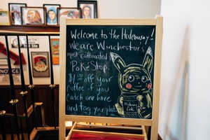 The photograph captures a whimsical chalkboard sign at a café, inviting visitors with playful text and a charming drawing of a Pikachu. The warm, inviting atmosphere is enhanced by soft lighting, which highlights the sign's colors against the backdrop of framed art on the wall. This playful layout suggests a casual and friendly mood, beckoning patrons to engage in both coffee and community.