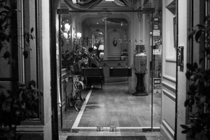 Framed by the glass doorway, the inviting interior of Hotel Belfas exudes an air of refined charm, enhanced by delicate furnishings and warm lighting. The monochrome palette adds a timeless sophistication, casting soft shadows that play across the polished floor. Outside, hints of foliage emphasize the serene yet luxurious mood, inviting passersby to step into an intimate world of elegance.