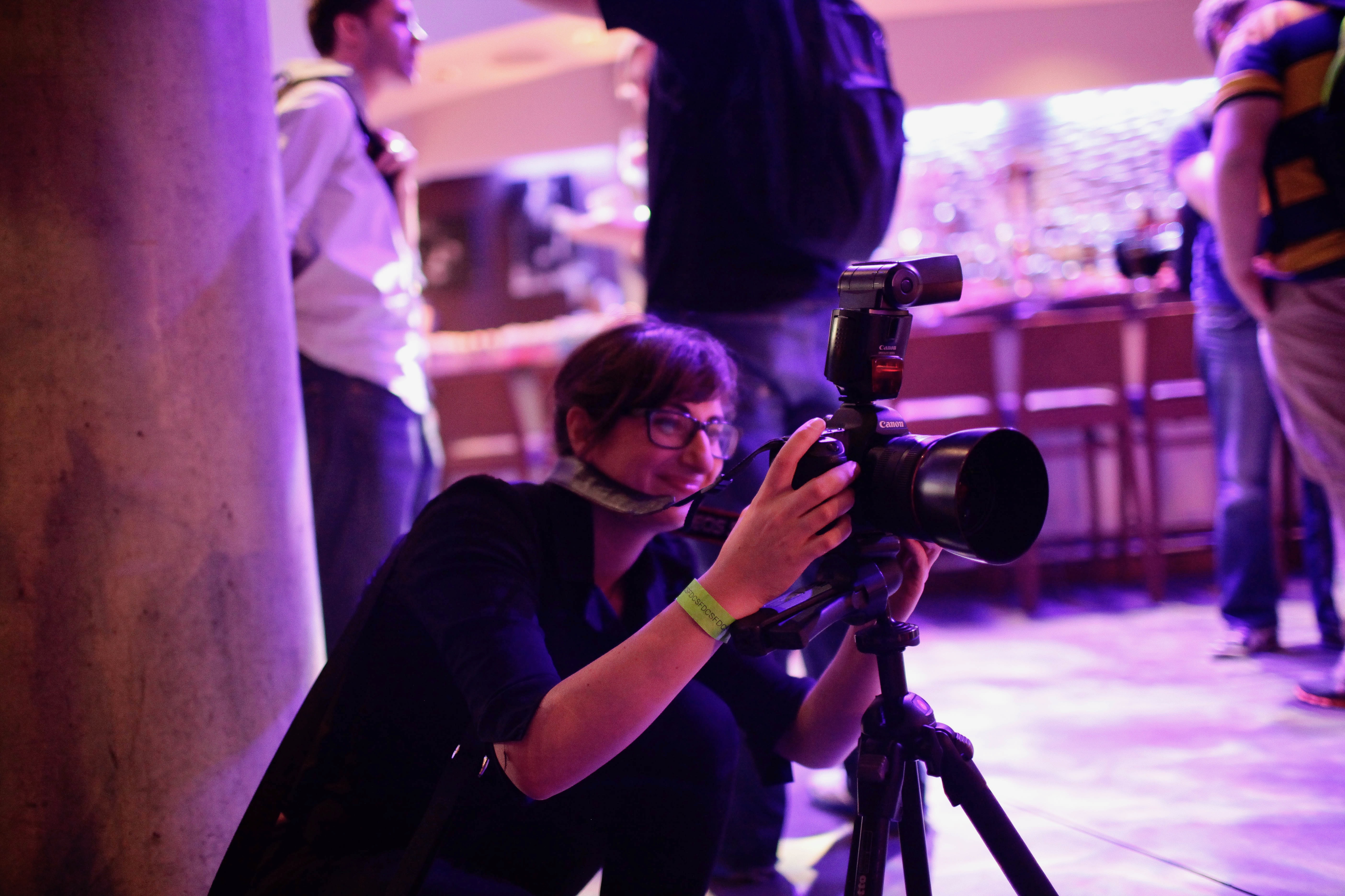 In a vibrant setting, a focused photographer captures moments from a lively event. The soft purple lighting creates an intimate atmosphere, enhancing the subject's concentration as she adjusts her camera. The angle captures the bustle of the background, contrasting with her solitary dedication to her craft.
