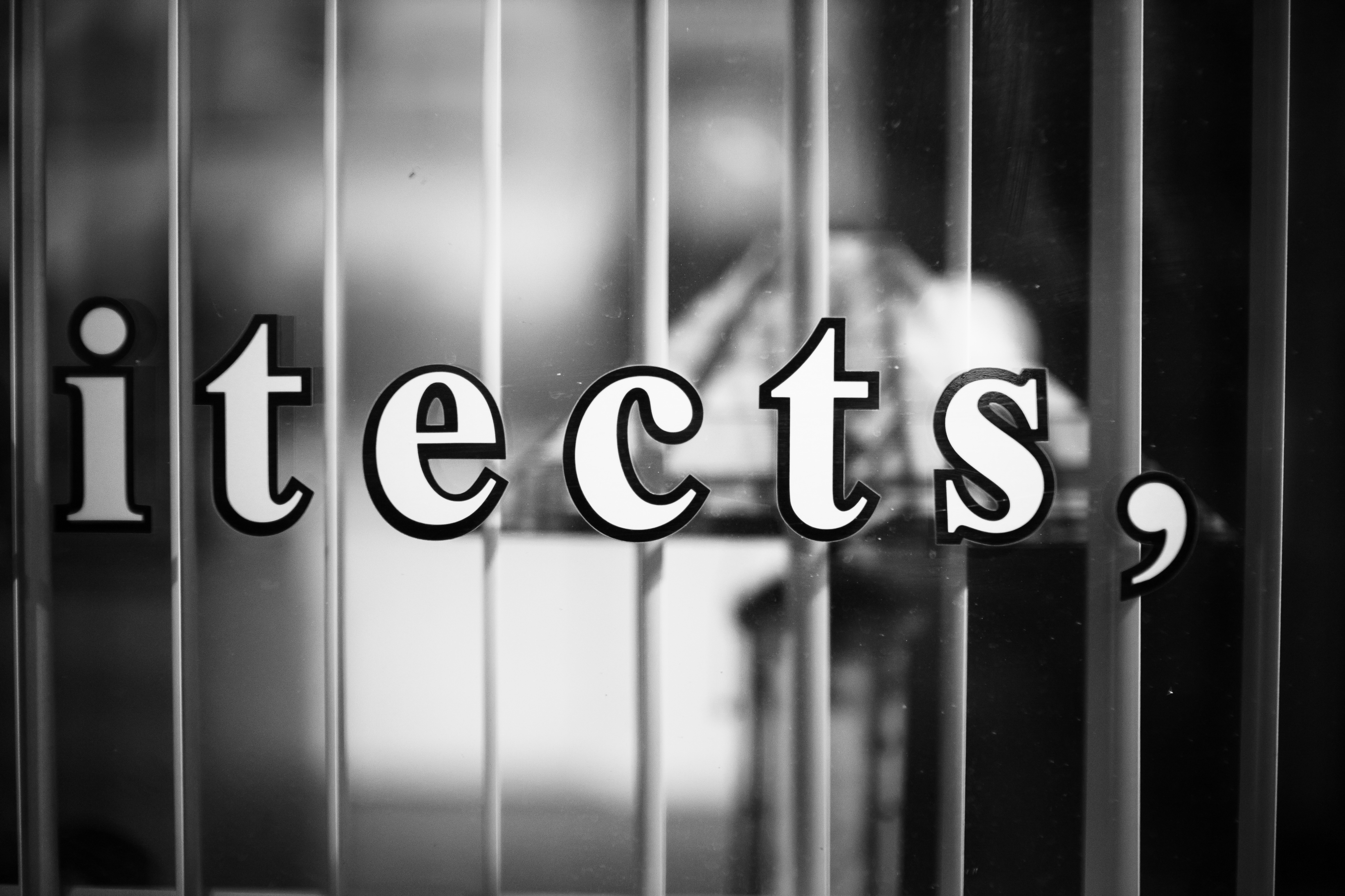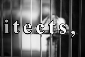 This photograph captures a close-up view of the word 'itects,' partially obscured by vertical blinds. The monochromatic palette enhances the mood of introspection and mystery, while soft reflections in the background suggest a world beyond the glass. The composition plays with focus and depth, drawing the viewer's attention to the text and the shadows that intertwine with it.