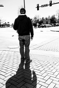 A lone figure stands at an intersection, silhouetted against the stark contrast of bright midday light. The mood is contemplative, with the pedestrian seemingly lost in thought, as their shadow stretches dramatically across the patterned pavement. The minimalist composition, accentuated by the absence of color, highlights the quietness of city life and the introspective moment within it.