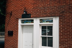 This photograph captures a quaint entryway of a brick building, featuring a pristine white door framed by colorful stained glass accents. The warm sunlight bathes the scene, creating a welcoming mood that invites curiosity. The composition balances the textured red bricks and white elements, emphasizing the unique character of this charming architectural detail.