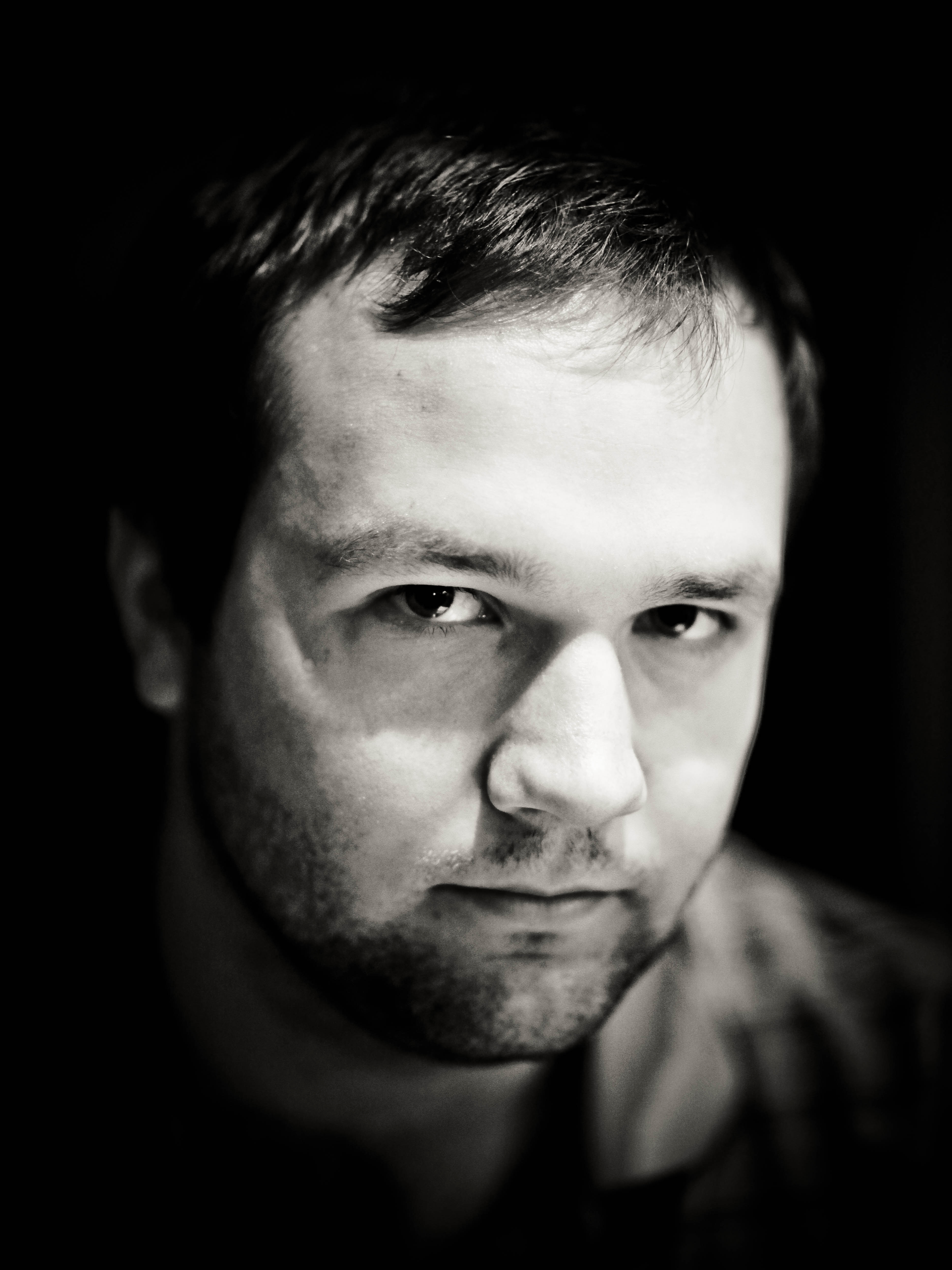 The photograph captures a close-up portrait of a man, his intense gaze penetrating through a dramatic play of light and shadow. The stark black background enhances the mood of mystery and introspection, while soft lighting accentuates the contours of his face. This evocative composition creates a palpable sense of depth and emotion, inviting viewers to delve into his thoughts.
