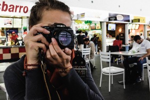 A young woman holds a classic Minolta camera, poised to capture the bustling atmosphere of a lively food court behind her. The soft lighting and blurred background create a warm, inviting mood, while her focused expression adds a sense of spontaneity and curiosity. This candid snapshot encapsulates a moment of creativity amidst the everyday hustle.