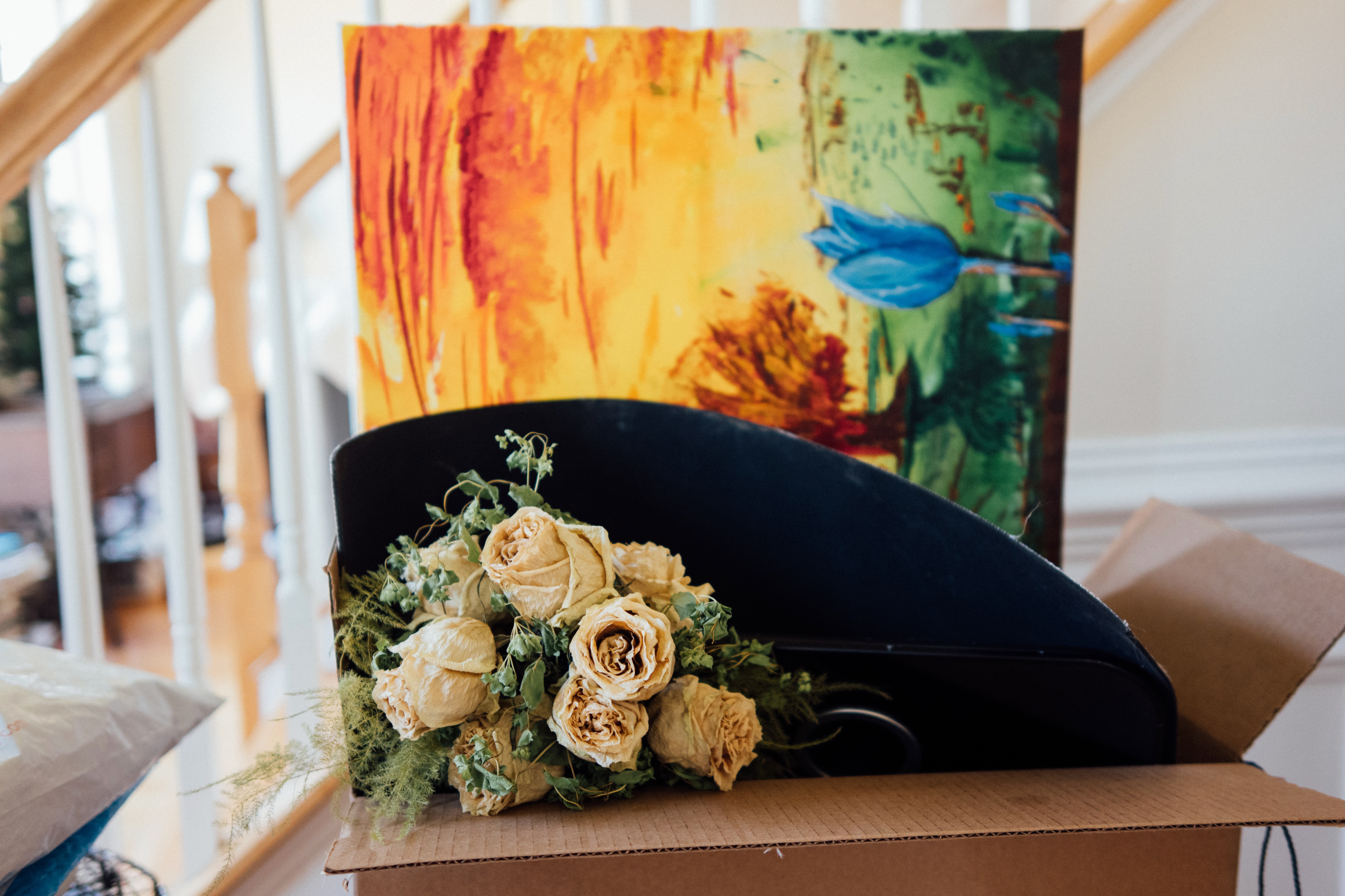 The photograph captures a poignant arrangement of dried roses resting inside a black container, placed amidst the backdrop of a colorful painting. Soft, natural light filters in, creating a serene yet nostalgic mood as the vibrant hues contrast with the muted tones of the roses. This composition evokes a sense of both preservation and decay, highlighting the beauty found in forgotten moments.