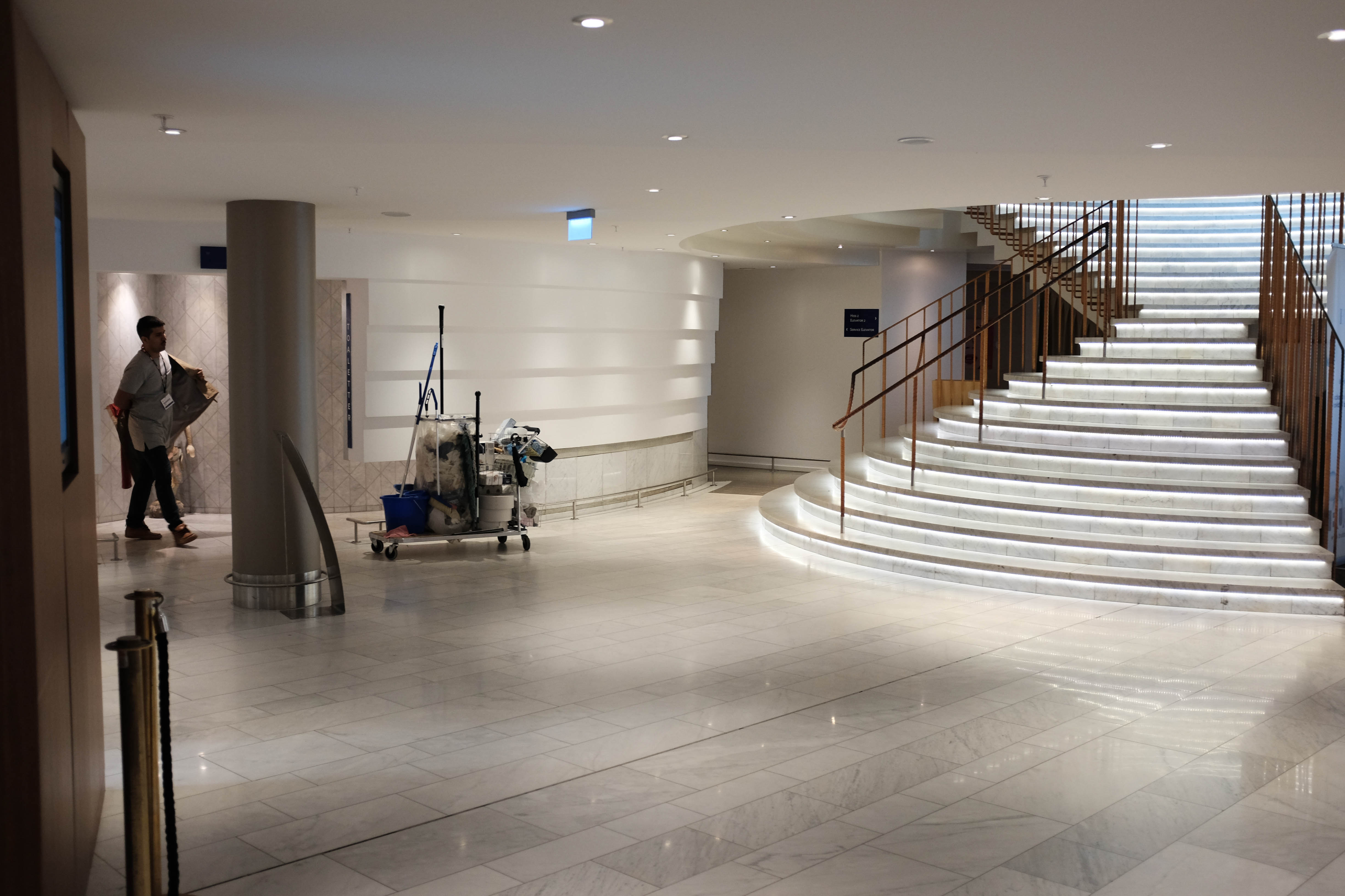 The photograph captures a sleek and modern lobby, characterized by its polished marble floors and soft, ambient lighting. A solitary figure walks past a cleaning cart, emphasizing the quiet solitude of the space, while a gracefully designed staircase draws the eye upward. The overall mood is calm and refined, reflecting a sense of understated sophistication within an architectural haven.