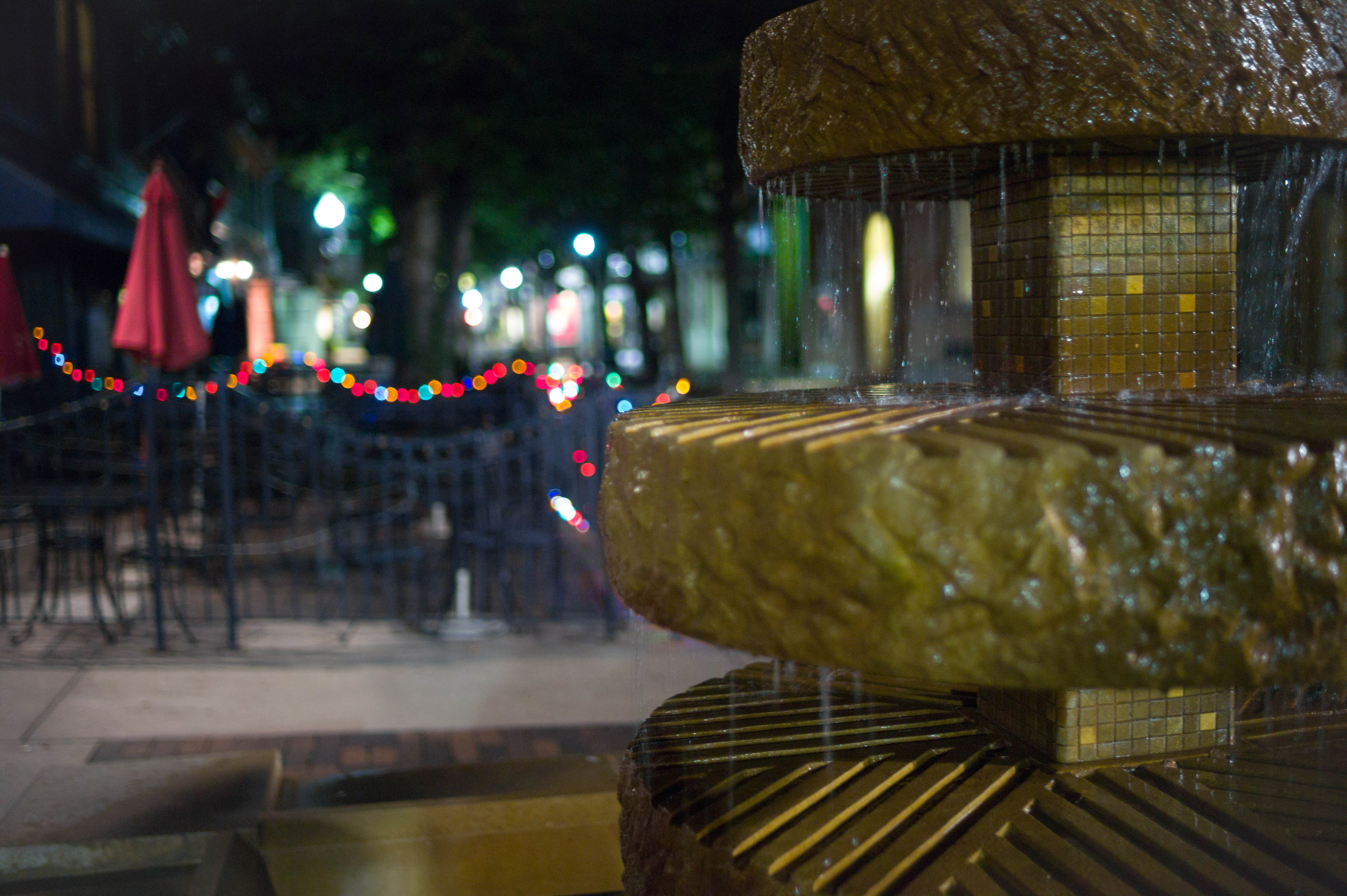 A close-up of a beautifully illuminated fountain in a quiet outdoor setting, glistening under soft nighttime light. The background hints at a festive atmosphere, with colorful lights adorning the nearby seating area, casting a tranquil yet lively mood. The composition, with the fountain in sharp focus, draws the viewer into this serene urban retreat.
