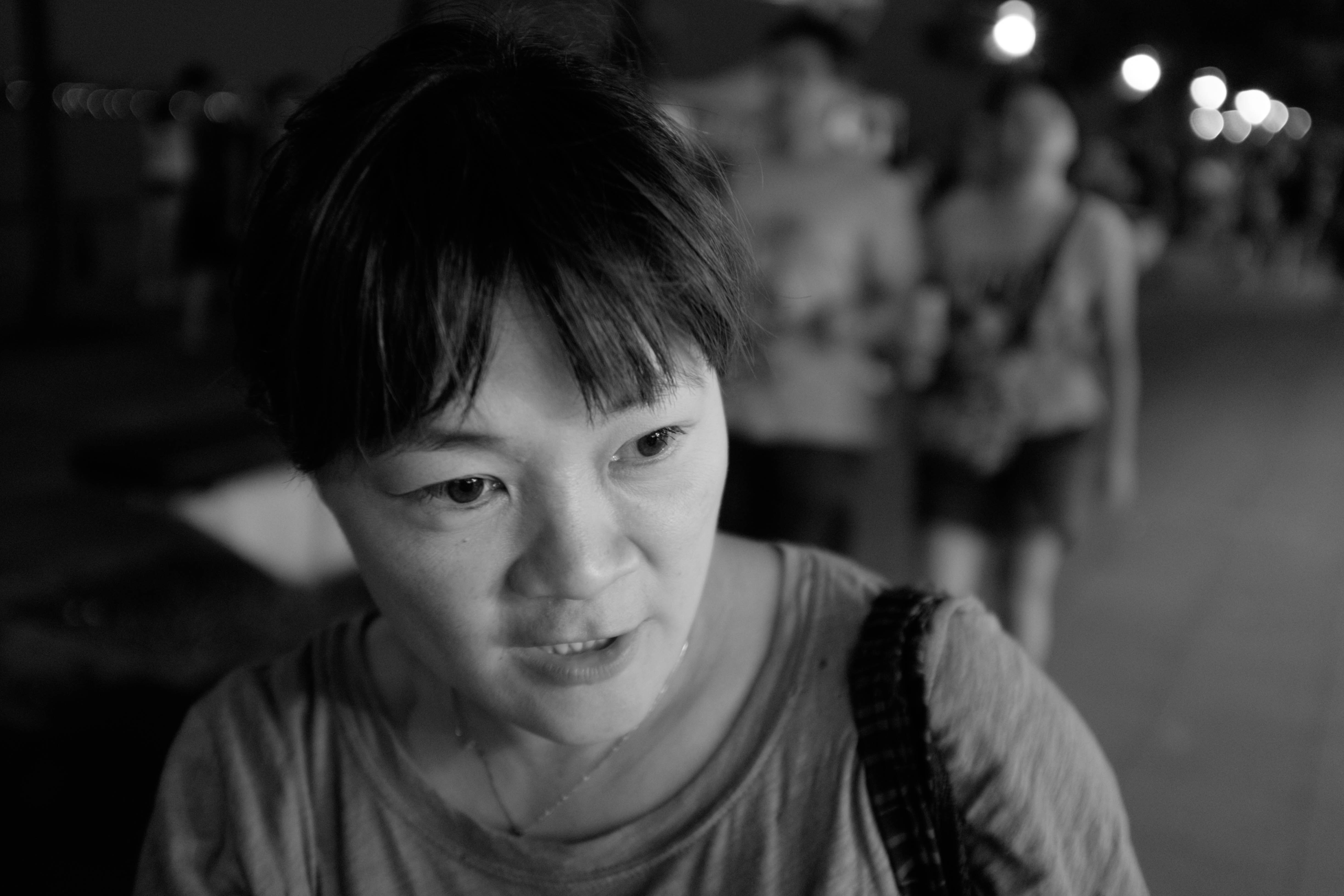 In this intimate black-and-white portrait, a woman offers a contemplative gaze amidst a softly blurred background of evening pedestrians. The low lighting enhances the emotional depth of her expression, creating a sense of intrigue and connection. The composition draws the viewer's attention to her facial features, alive with texture against the vibrant nightlife behind her.