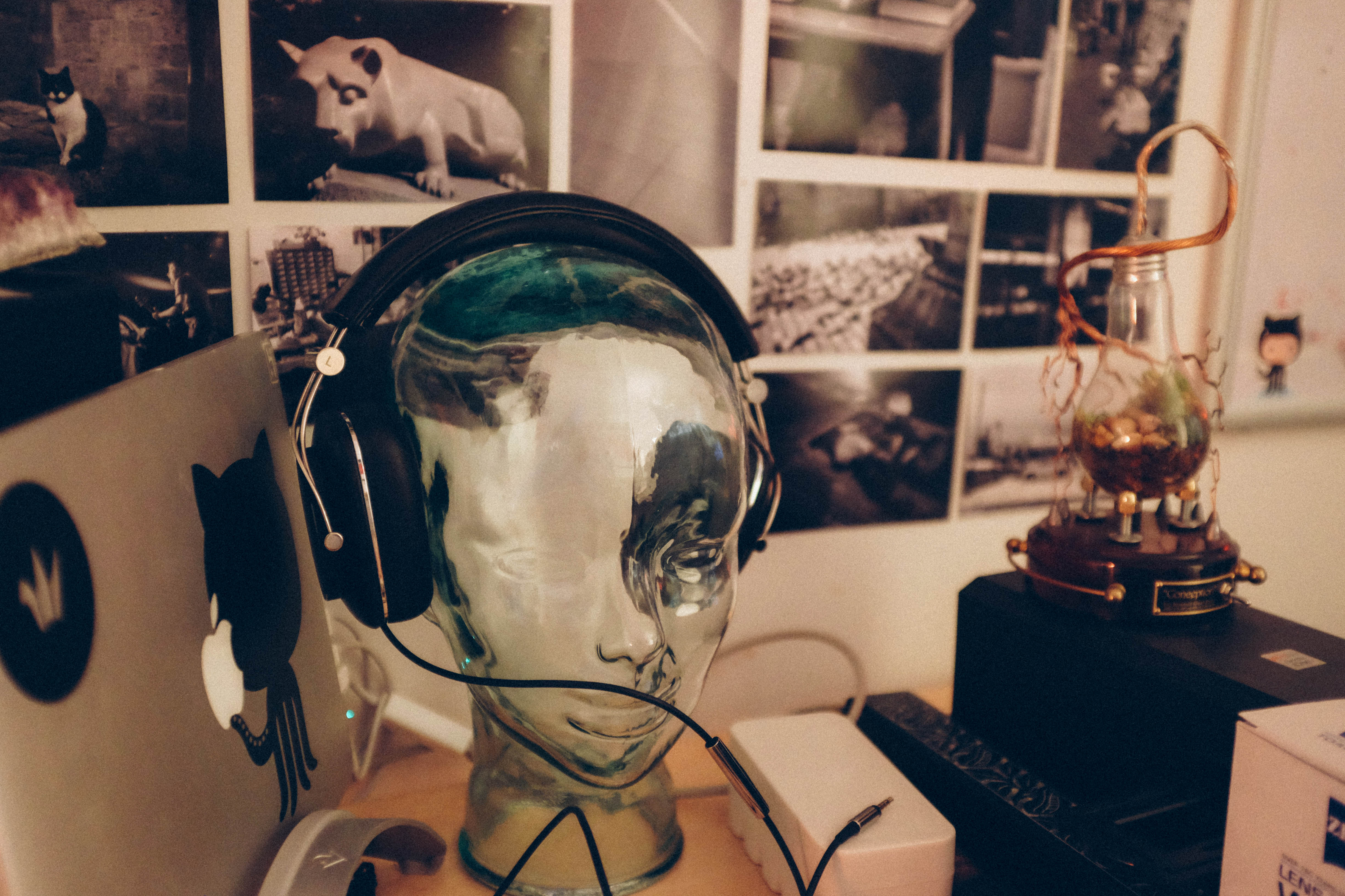 This photograph captures a striking glass mannequin head adorned with sleek headphones, symbolizing a fusion of technology and artistry. The soft, warm lighting casts a nostalgic glow across the cluttered workspace, while the backdrop of black-and-white photos adds layers of visual intrigue and a hint of personality to the scene. The overall mood is contemplative, inviting viewers to consider the intersection of sound and creativity.