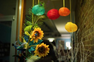 This photograph captures a lively arrangement of colorful lanterns hanging above a striking display of sunflowers and peacock feathers. The warm, bright hues interplay against the rustic brick backdrop, creating a cheerful and inviting ambiance. Soft lighting enhances the vibrant colors, evoking a sense of joy and celebration in the space.