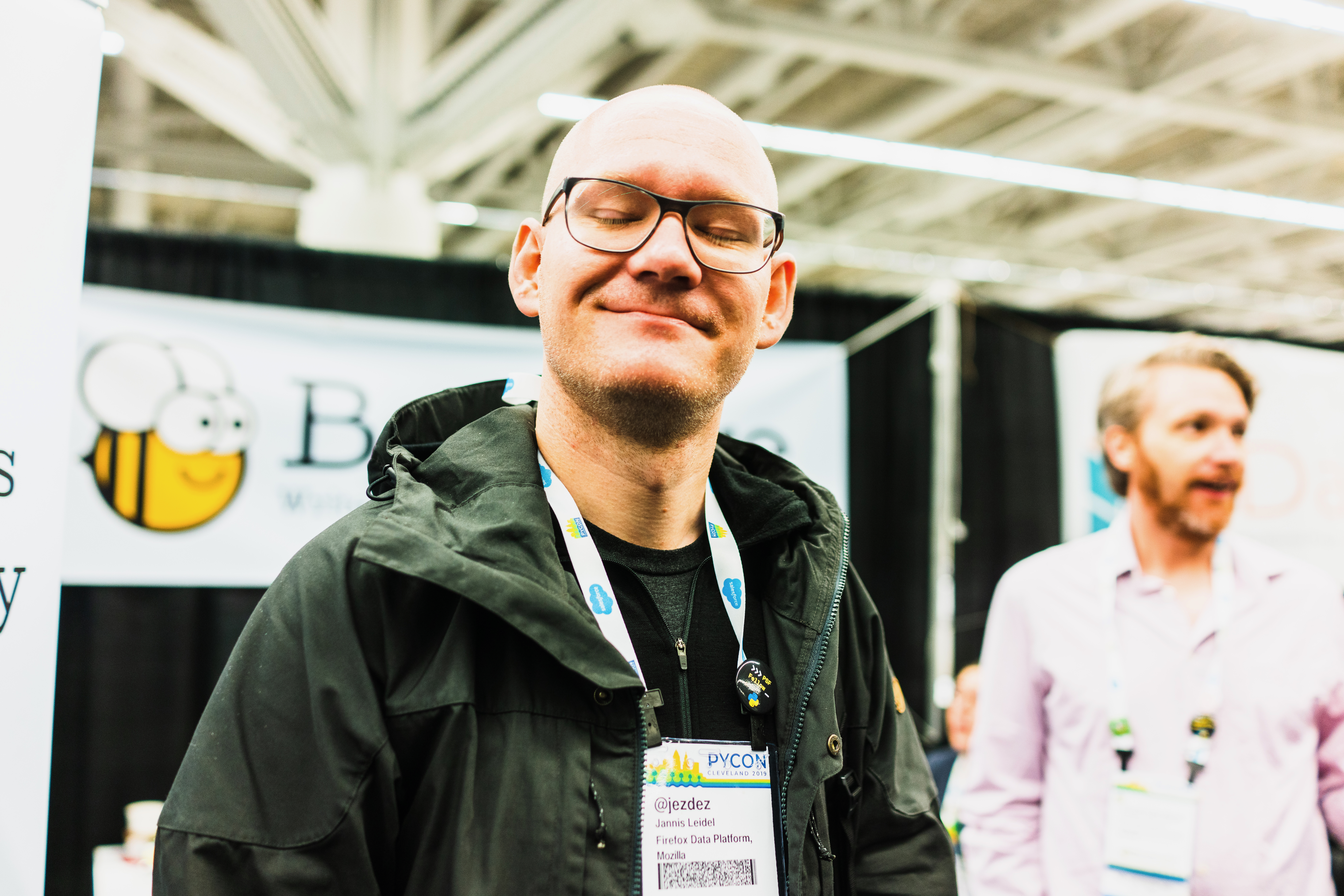 In a bustling conference setting, a man with a shaved head and glasses stands confidently, radiating a relaxed happiness. His slight smile and closed eyes suggest a moment of contentment amid the chaos, while a colleague lingers in the background, adding depth to the composition. The bright lighting and soft colors contribute to an inviting and cheerful atmosphere.