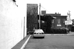 In this monochromatic scene, a lone car occupies a narrow urban parking space, surrounded by an interplay of textures and structures. The stark contrast between the white wall and the dark ivy-clad building evokes a sense of isolation, while the muted lighting adds to the somber mood. Wires crisscross overhead, further emphasizing the urban environment's complexity and its quiet, almost forgotten corners.