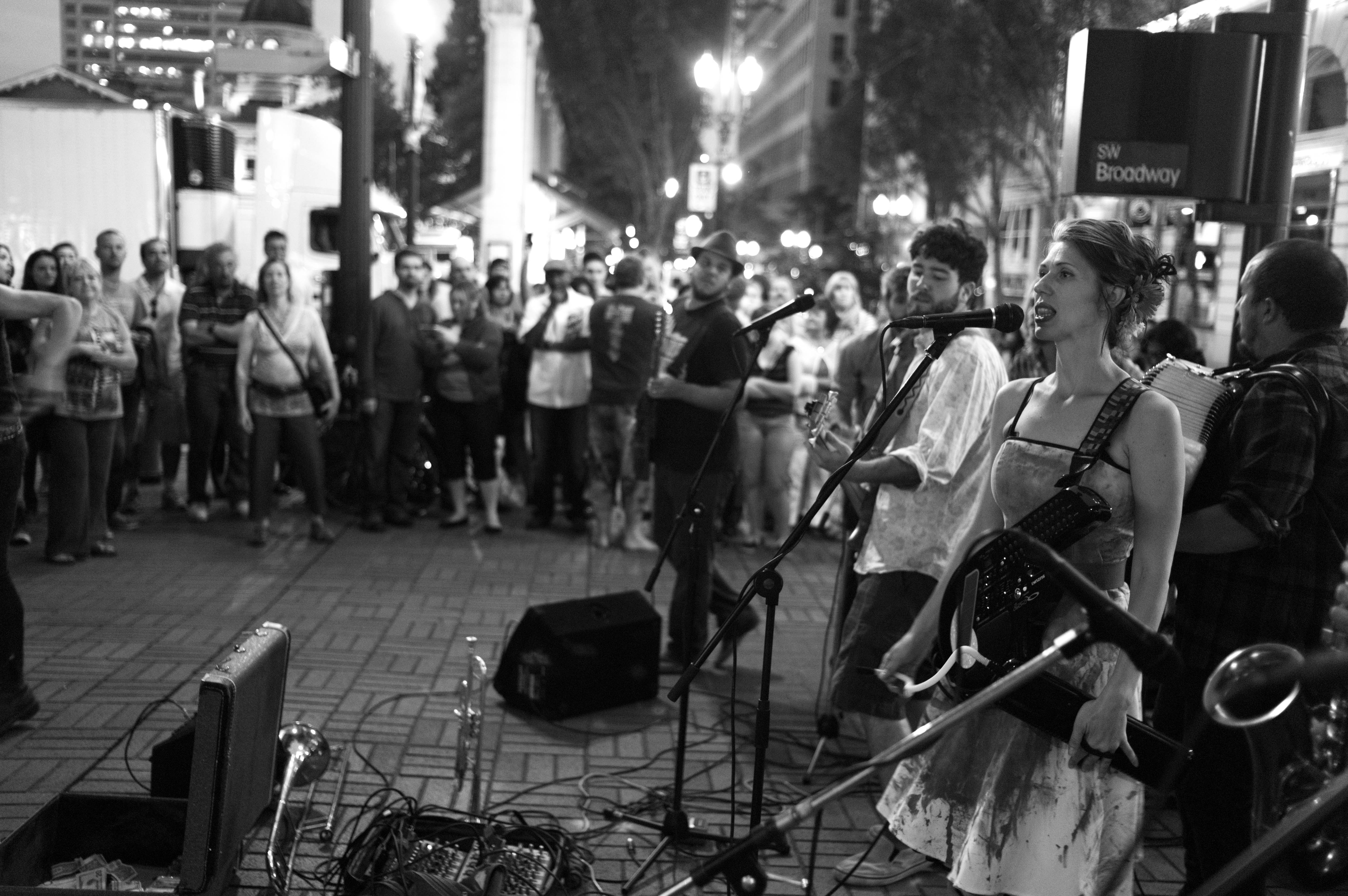 In this dynamic black-and-white scene, a group of musicians captivates a lively crowd on a city street. The contrast of the performers against the backdrop enhances the electric atmosphere, illuminated by warm streetlights that create an intimate yet vibrant mood. The audience's engagement reflects the universal joy of shared music in an urban setting, filled with anticipation and connection.