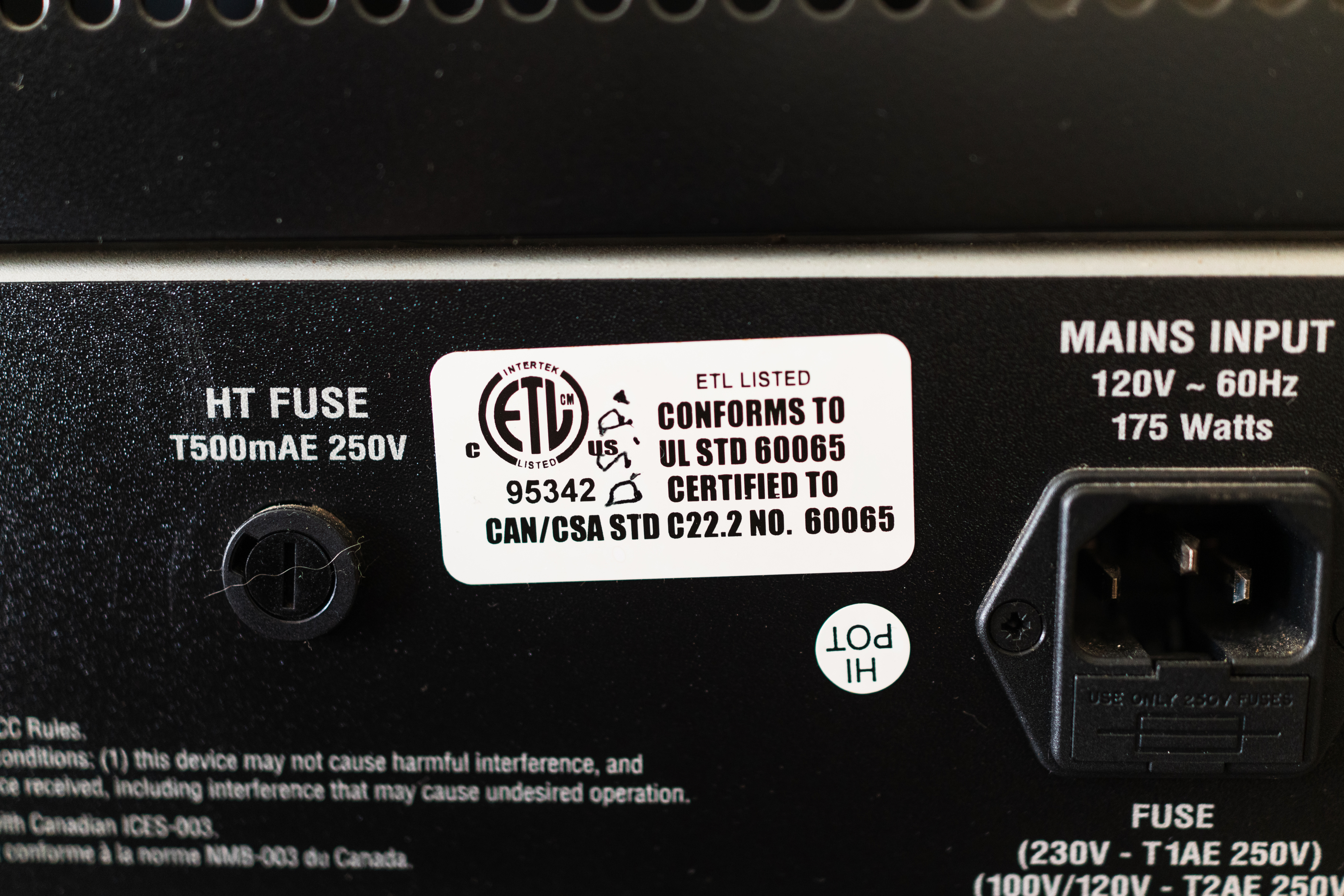 This photograph captures the intricate details of an electrical device's rear panel, showcasing certification labels and connection ports. The lighting is bright and even, highlighting the crisp text and textures of the materials, while the overall composition centers around the technical information, creating a mood of clarity and precision.