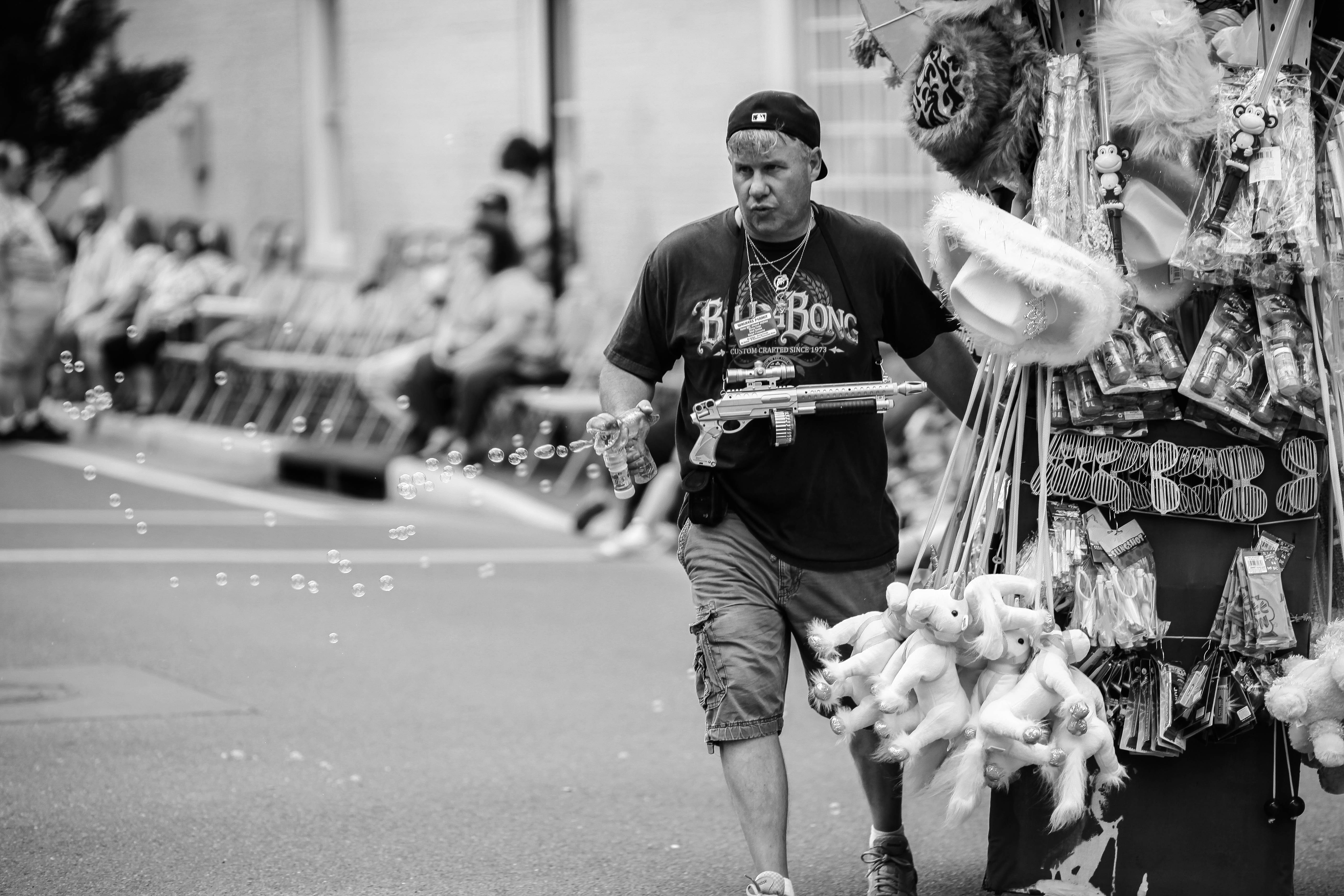 A man strolls past a colorful stand at a parade, casually holding a bubble-blowing wand while dressed in casual attire. The scene, captured in black and white, exudes a nostalgic atmosphere, highlighting the juxtaposition of fun and the serious demeanor of the vendor. Soft bubbles float in the air, adding a whimsical touch to the otherwise straightforward setting.