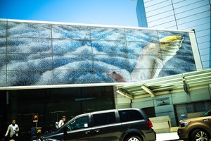 The photograph captures a striking mural of a soaring bird against a backdrop of stylized clouds, set on a modern building facade. Sunlight bathes the scene, enhancing the vibrant colors and creating a dynamic interplay between art and architecture. Below, the silhouettes of people and vehicles contrast with the soaring imagery, infusing a lively, urban energy into the composition.