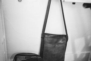 In this monochrome composition, a leather bag hangs against a textured wall, embodying a sense of quiet solitude. The soft lighting highlights the bag's details, while shadows add depth and intrigue, inviting viewers to ponder the stories held within. The simplicity and focus create a contemplative mood, capturing a fleeting moment in a space often overlooked.
