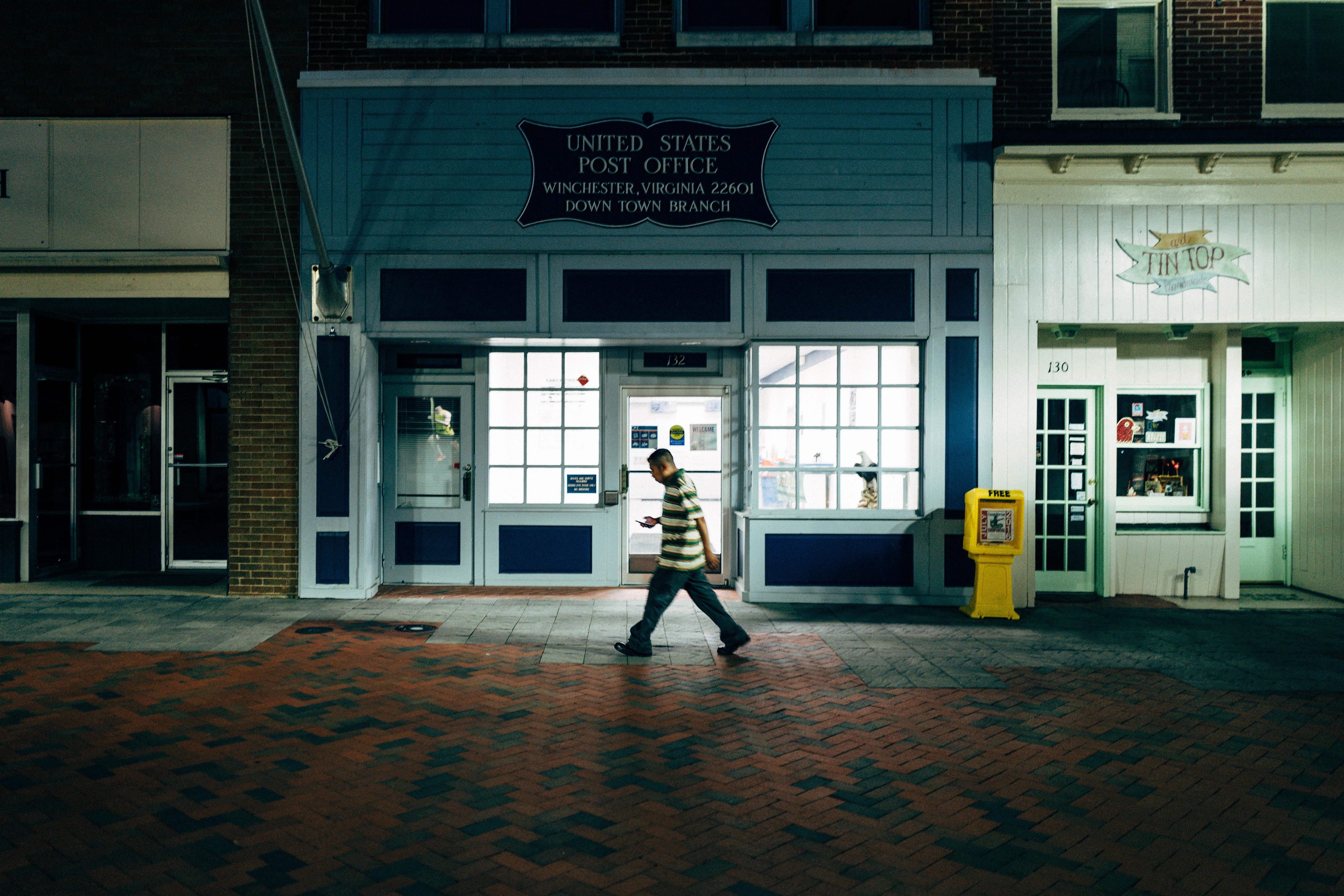 A figure strides along a brick sidewalk, illuminated by the warm glow of a nearby post office. The contrast between the nocturnal setting and the vivid light evokes a sense of solitude and quiet contemplation. The composition captures the essence of small-town life, with storefronts lining the street, hinting at a community that thrives even after dark.